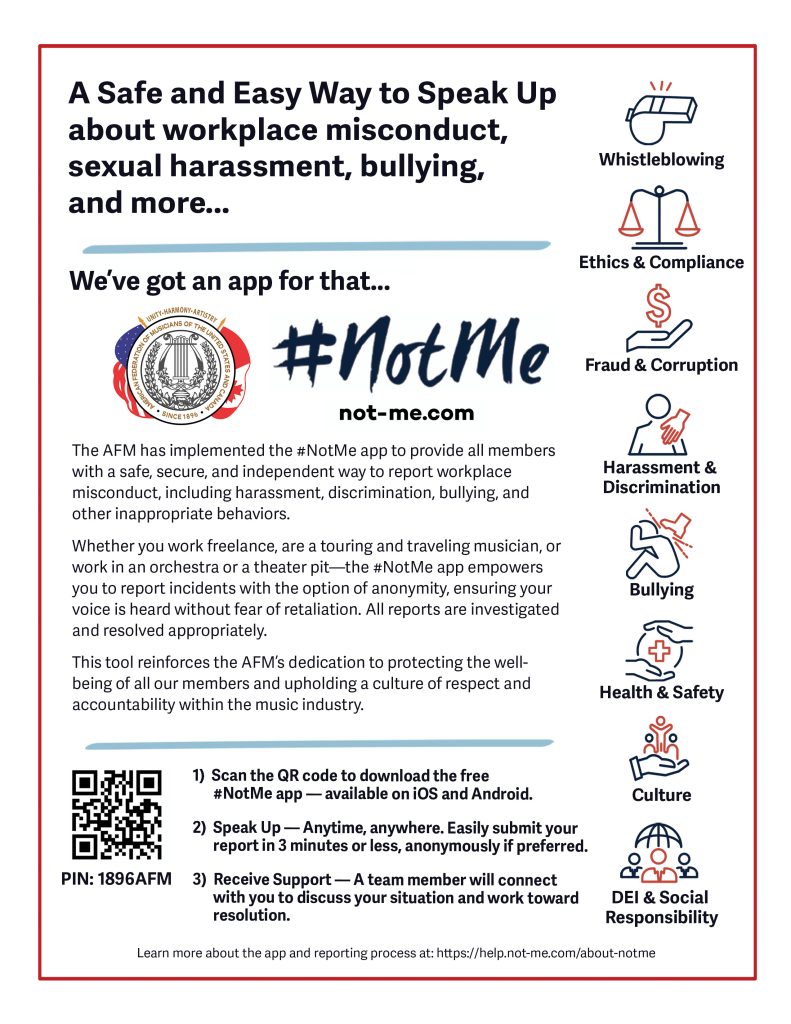 We are proud to announce the AFM’s partnership with NotMe Solutions to launch the #NotMe platform, providing AFM members with a secure, anonymous way to report workplace misconduct, including harassment and contract violations. This free, encrypted app empowers musicians to speak up safely, ensuring their concerns are taken seriously while fostering a more inclusive and respectful work environment.